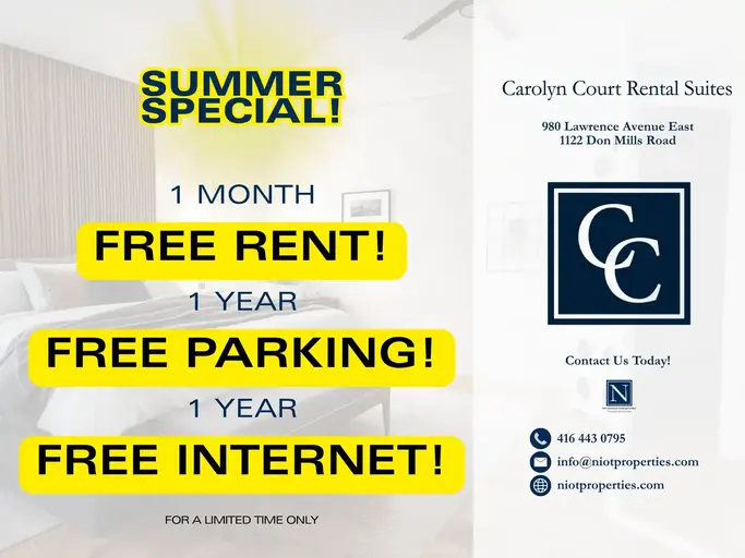 OFFERING A LIMITED "SUMMER MOVE IN SPECIAL "  ONE MONTHS FREE RENT , ONE YEARS FREE PARKING AND ONE YEARS FREE INTERNET MOVE-INS DURING THE MONTHS OF JULY AND AUGUSTWe are taking applications for  beautifully renovated  suites available for July, August and September at Don Mills Road & Lawrence Ave. East. The units  are freshly painted, with refinished hardwood floors, "granite-like" kitchen countertops, stainless steel appliances and many other upgrades. The building is located directly across the street from "Shops At Don Mills." minutes to the DVP and TTC at your door step. The building is well maintained with friendly residents. Rent includes   heating and water. Hydro and parking are billed separately. Management office and superintendent located on-site. If you are interested in making Carolyn Court your new residence, kindly telephone our Property Management office or visit our award-winning website at http://www.rentindonmills.com.  We are also available for Facetime viewings. We are proud to have achieved a 98% score with The City of Toronto RentSafe Program.  This program is a Registration and By-Law Enforcement program for all apartment buildings in Toronto.  The program applies to all residential rental apartment buildings and scores buildings in accordance with their RentSafe Officers inspection after review of all the properties in the City of Toronto.Covid Measures:The health and safety of our residents is of the utmost importance to us. Our professionally trained staff is diligent to ensure that your building remains clean and safe. We have the Clean Suite Program in place for an added level of protection for you and your family before you move-in! This involves:Entire suite prior to occupancy  is twice lysol and bleached cleaned  with this Health Canada approved disinfectant: This includes all Bedrooms(s), Bathroom(s), Living Room, Closet(s), Kitchen.In additionMicrobe shield treatment of the high-touch areas including: All Doorknobs & Handles, Light switches in all common areas of the building. Carolyn Court Rental Suites Management Office. Suite 100980 Lawrence Avenue EastDon Mills, ON, CanadaM3C 1R2Phone: 416.443.0795Fax: 416.443.1147